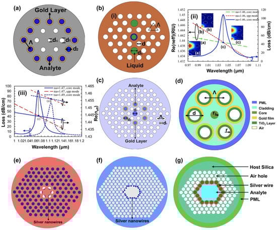 Metal coating-based plasmonic PCF sensors. (a) gold coated in the second ring (, , , µm and gold layer thickness equal to 40 nm); (b) (i) selectively silver deposited core (, , , µm and silver layer thickness equal to 40 nm), (ii) field distribution with phase matching phenomena; and (iii) phase matching phenomena shifted with varying analyte RI. (c) Selectively gold-coated with liquid-filled core (, , , µm and gold layer thickness, nm); (d) multiple holes coated with gold-TiO2 layer ( µm, µm, µm, gold layer thickness equal to 30 nm and TiO2 layer thickness equal to 75 nm); (e) liquid and silver nanowire filled temperature sensor; (f) hollow-core filled with liquid and silver nanowires and (g) silver-wire filled HC-PBF, reprinted with permission from [].