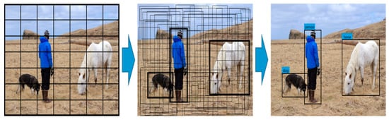 In 2016, Redmon et al. proposed the end-to-end object detection method YOLO [23]. As shown in Figure 1, YOLO divides the image into S × S grids and predicts B bounding box and C class probability for each grid cell. Each bounding box consists of five predictions: w, h, x, y, and object confidence. The values of w and h represent the width and height of the box relative to the whole image. The values of (x, y) represent the center coordinates of the box relative to the bounds of the grid cell. The object confidence represents the reliability of existing object in the box, which is defined as.