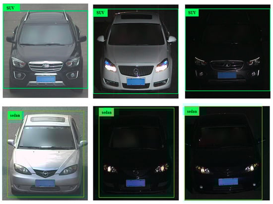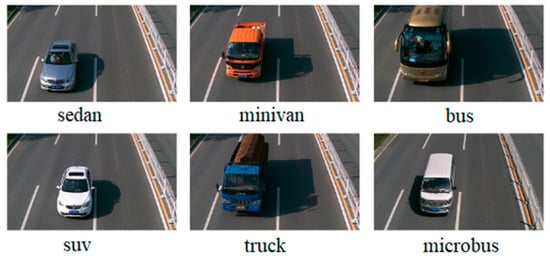 In this paper, two vehicle datasets collected from road monitoring, the Beijing Institute of Technology (BIT)-Vehicle [28] and CompCars [29], were used. The BIT-Vehicle dataset was provided by the Beijing Institute of Technology and contains 9580 vehicle images. It includes six vehicle types: sedan, sport-utility vehicle (SUV), microbus, truck, bus, and minivan. The number of images for each type is 5922, 1392, 883, 822, 558, and 476, respectively. The CompCars dataset was provided by Stanford University and consists of two sub-datasets. One dataset involves commercial vehicle model pictures collected from the internet, with 1687 vehicle types. The other involves vehicle pictures collected from road surveillance cameras. CompCars only includes two vehicle types: sedan and SUV, with more than 40,000 images. Both datasets include day scenes and night scenes. In addition, the images in both datasets are on sunny days, and there is no presence of noise background, rain, snow, people, other vehicle types, and so on.