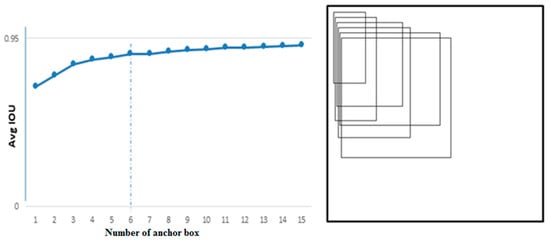 As shown in Figure 4, by analyzing the clustering results, the value of k was finally set to be 6, which meant that six anchor boxes of different sizes would be applied for positioning. The right side of Figure 4 shows the six clustering anchor boxes. From the anchor boxes, it can be seen that some clustering anchor boxes were thin and long, while some were square. Those shapes conformed to the actual shapes of the six vehicle types, while the information regarding the distance from the camera was also included. Thus, using clustering analysis on the training dataset with k-means++, the sizes of the anchor boxes suitable for vehicle detection could be obtained, which may improve positioning accuracy.