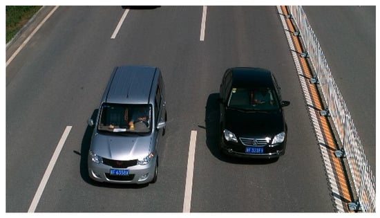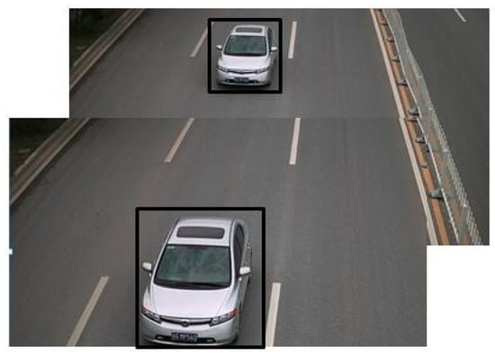 For vehicle detection, since the vehicle picture was obtained from road surveillance cameras, this meant that the vehicle approached the camera during detection. As shown in Figure 5, when the car is far from the camera, it appears smaller in the picture. When it is closer to the camera, it takes up a larger area in the image. Therefore, even if the vehicle type is identical, the size may be different in the picture.