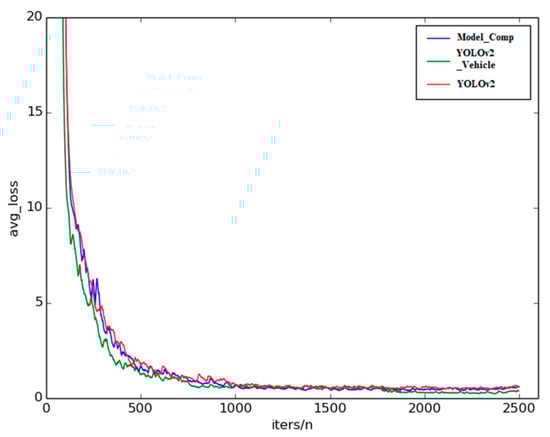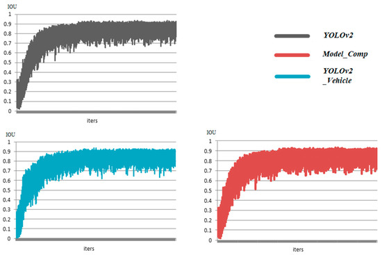 During training, the trend of the average IOU of each model also needed to be considered, because it represented the accuracy of the detected bounding boxes. As shown in Figure 8, the average IOU of the three models showed a gradual upward trend. They were all stable between 0.7 and 1, which shows that the three models had a good performance when locating. Although the IOU results of the three models were close, the initial upward trends of Model_Comp and YOLOv2_Vehicle were faster than that of YOLOv2. In particular, the average IOU of YOLOv2_Vehicle quickly reached between 0.6 and 0.7 in the initial stage, while YOLOv2 needed more training time, which also proves that the network of YOLOv2_Vehicle could accelerate the convergence of the vehicle dataset.