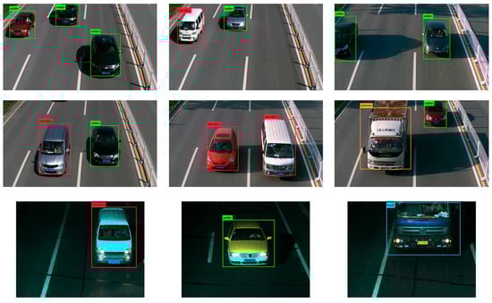 Figure 9 shows the detection results of the YOLOv2_Vehicle model. It can be seen that the YOLOv2_Vehicle model had good performance for both single and multiple vehicle detection. Whether it was daytime or night, the abilities of vehicle positioning and type recognition of YOLOv2_Vehicle were not affected, which proves that YOLOv2_Vehicle has strong weather adaptability. In addition, in the three pictures of the third column in Figure 9, there were some incomplete vehicles. However, from the actual detection results, such a situation did not affect the vehicle detection accuracy of the YOLOv2_Vehicle model. It reflects that YOLOv2_Vehicle has the ability to complete vehicle positioning and type recognition with the vehicle’s local information, and reflects the effectiveness of the multi-layer feature fusion strategy.