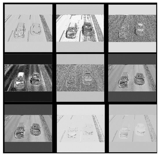 Usually, the evaluation metrics for vehicle detection are mAP and speed; however, there exists another way to evaluate the model, i.e., by visualizing the network [30]. This method can observe the quality of the features and the ability of the network for extracting features more directly. Taking a road vehicle image (Figure 11) in the BIT-Vehicle dataset, for instance, the visual features of the YOLOv2_Vehicle model were presented and analyzed. Figure 12 shows the first nine feature maps of Figure 11 after passing through the first convolution layer. It can be seen that most feature maps contain vehicle edge information, which indicates that the convolution kernel in the first layer successfully extracted the edge information of the vehicle.