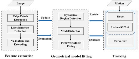 Finally, tracking the parameters in the geometric model is a key component for enhancing the robustness of the algorithm. Kalman filtering is widely used in this step [,,]. Some authors [] proposed a parallel assumption about both sides of the road lane. The width of the lane, angle of deviation, and lateral offset between the middle of the lane and the projected center of the camera were used to construct the status vector of the car. However, the lack of consideration of curvature makes this method unsuitable in a curved environment. Nieto et al. [] efficiently designed and implemented a particle filter by separating the state into linear and nonlinear parts.