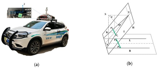 (a) Position of the camera on the vehicle. (b) Pin projection model of monocular camera between image plane I and road plane R. The focal length of the camera is described as the distance between project center S and optical center O. Pairs of edge points on both sides of the lane, marked L and R, can be described as  and  on the road plane and  and  on the image plane, respectively. The distance SN is the height of the camera. The pitch angle of the camera is  and V is the vanishing point of L and R. SK is the projected length of the distance from the middle of  and  to V.