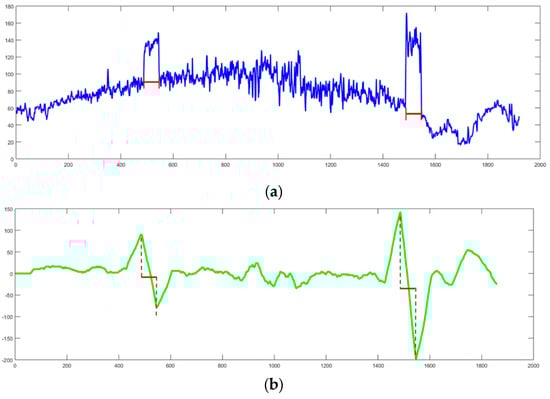 (a) Raw intensity of a row of the image. (b) Result of gradients corresponding to the input row of the image and the red line present that the pixel width of the peak and valley is equal to the widths of lane markings.