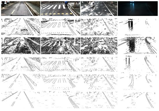 The proposed method starts by extracting robust and discriminative features from road images. As lane markings comply with specific standards in most developed countries, with a fixed width of bright lines or curves on dark backgrounds, the dark–bright–dark pattern of lane markings is widely used. Some studies used a two-dimensional Gaussian kernel containing a smoothing Gaussian and a second-derivative Gaussian to filter an inverse perspective mapping image [], but errors commonly occurred in distinguishing road markings and curbs. Another proposed method [] used the width of the lane markings to construct a symmetrical local threshold (SLT) edge detector, and concluded that extractors like symmetrical local threshold (SLT) produce the best result in most cases. However, the method used for estimating the width of lane markings in that paper is unstable and sensitive to variability in the pitch angle of the camera. When the environment is complex and contains shadows, bright spots, and other challenging illuminations, the poor accuracy of the widths of lane markings cannot prevent the extractor from disturbances due to complex illumination.