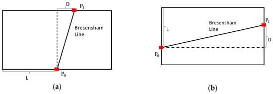 Vertical (a) and horizontal (b) line segments described in Bresenham line voting space (BLVS). L is the lateral displacement of end point P0 at the bottom edge of the space and D is the deviation from P0 to end point in the top edge P1.