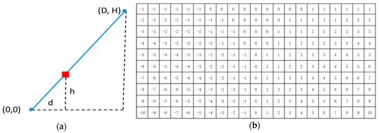 When the ranges of D and H of the detection grid have been determined, the cells of the lookup table record displacement information is used to calculate pairs of L and D to find all possible line segments that would cross the marker point. As shown in Figure 6, the lookup table can be initialized by generating a Bresenham line segment from bottom to top. The displacement value is calculated and saved step-by-step. Figure 6b depicts an example of the lookup table, which has initialized the deviation parameter D, which belongs to [–10, 10], and the height H of the table is 10.