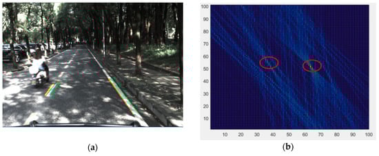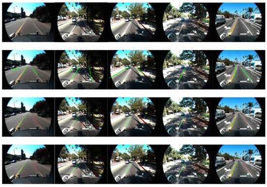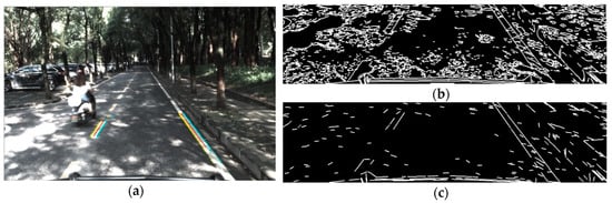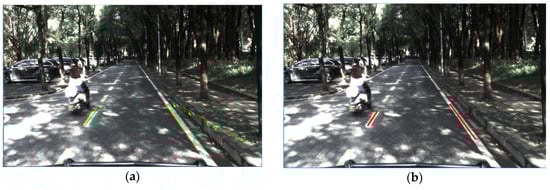 Various lane detection methods have been developed for simple and complex environments. Most lane detection methods can be decomposed into the following three steps: Feature extraction of lane markings is first performed, including edge point and line segment extraction. Color, gradient, and intensity are three typical characteristics of lane markings. Sobel [], Canny [], Steer filter [] and Garbor [] filters are gradient-based and intensity-based edge point extraction methods. Based on the edge information extracted by these detectors, Hough transform [,,,], line segment detector (LSD) [], edge drawing line detector (EDLines) [] and fast line detector (FLD) [] are then used to find straight lines in the image edge. The maximally stable extremal regions (MSER) method was proposed by Küçükmanisa et al. [,] to solve lane detection problems in a complex environment, such as shadows or at night. Finally, some deep learning-based methods [] have been proposed to extract lane features in end-to-end environments, which have achieved higher accuracy than traditional methods.
