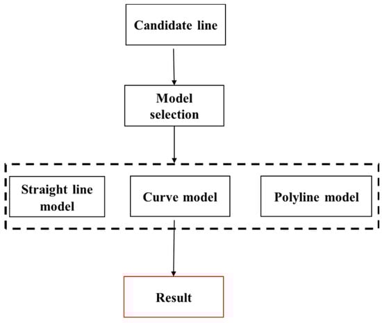 Figure 10 shows a flowchart of the model selection of our method. The type of candidate lane was considered first because the solid lane was continuous. First, the straight model was applied to probe the far region where the shape of the road was straight. Then, the curve model was used when the slope deviation between the adjacent line segments expanded the given threshold in the first step. A second-order curve model initialized from the end points of the candidate line segments was used to fit the feature points in the far region. When the residual error of the curve model met the continuous condition, a larger range of detection beginning with the end of the curve was created to ensure that all possible lane markers were included. Efficiency in this condition is lower, but the speed of the vehicle must be reduced at the same time.