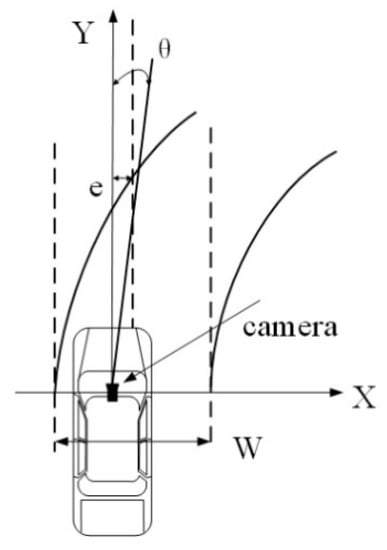 In order to track the key points belonging to the nonlinear segments, a curve model of the road proposed by Watanabe et al. [] was used. Figure 11 shows the curve model of the road, where the width of the ego-lane W, the lateral displacement between the center of the camera and the center of the ego-lane , the yaw angle  of the lane to the y-axis in the road plane, and the curvature of the lane were used in the status vector, as shown in Equation (12). In addition, the corresponding transfer matrix is described by Equation (13).