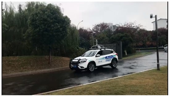 During the evaluation stage, it was necessary to test the algorithm on a real-time road environment using autonomous platforms, so we installed our program on an autonomous vehicle and combined it with a model predictive control (MPC) component to control the vehicle along the campus road in Wuhan University, Wuhan, China, as shown in Figure 13. The trajectory of motion planning was replaced with the middle line of both sides of the lane. The lane detection component in that system provided low-cost resolution for positioning the vehicle between both sides of the road.