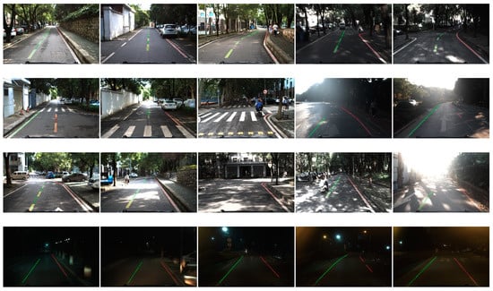 As an effective method to improve the transportation efficiency and reduce the risk of road accidents, automatic driving has been developing rapidly. Vision-based lane detection algorithms not only provide lane departure warning (LDW) to advanced driver-assistance systems (ADAS), but also guide autonomous vehicles to drive along the ego-lane by themselves. Lane detection algorithms developed from early experimental prototypes like AutoVue [] and GOLD [,] to various commercial applications. A standard configuration of an lane departure warning systems (LDWS) can be broadly divided into three parts: Lane detection, lane tracking and lane departure []. Sequences of road images are captured by an onboard-camera high up on the windshield, and lane departure alerts occur to protect the driver from some unintended dangerous driving behaviors. Most of these products are designed for highway and freeway driving, where the illumination conditions and geometric models of the road are simple. However, to expand the coverage of intelligent transport systems, lane detection systems should also work robustly on local low-speed roads.