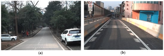 Compared with the high-speed structural road environment, road shapes in local low-speed environments are complex and variable. Complex environments are challenges for the real-time and robustness requirements of autonomous vehicles and robots. Many proposed methods have attempted to solve this problem by using light detection and ranging (LIDAR) [,,,], stereo cameras [,,], or multiple sensors []. Typical characteristics of the low-speed road are as follows: The speed limit of the road is under 30 km/h; the width of the road is narrow; the geometrical model of the road is diverse. Besides, the number of lanes in low-speed roads are less than four which means that usually a continuous solid line exists on one side of the ego-lane. According to the differences of the road surface, the low-speed environment can be divided into two types in some developing countries like China: Structure road with well-covered lane markings on the cement or asphalt surface, unstructured road without lane markings with pit or rut on sand or dirt road. The proposed method provides a robust lane detection method for the first low-speed environment based on a monocular camera. There are two main advantages of using a monocular camera: It is inexpensive and easily meets real-time requirements, and provides dense information about the environment.