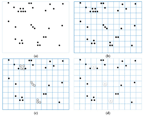 The cluster process is shown in four steps: (a) The original sample data; (b) The results after dividing the area and setting the density; (c) The results of the first clustering; (d) The final clustering results.