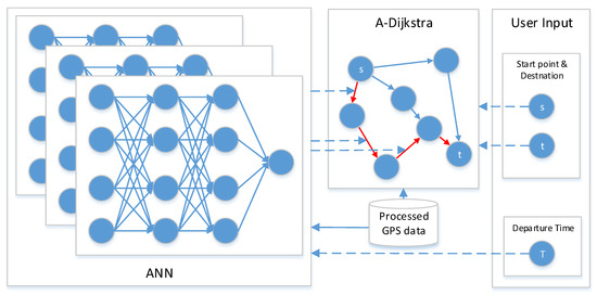 Firstly, we propose an ANN-based short-term traffic flow prediction model to predict traffic speed by given time and given roads. The ANN model was trained using GPS data processed by V-CLIQUE. Secondly, a relatively optimal path algorithm A-Dijkstra is proposed to calculate the optimal path according to traffic speed that the ANN model predict. Lastly, for a given start point, destination, and departure time, the optimal path is calculated. The architecture of the model is detailed in Figure 4.