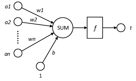 F is the transfer function, usually a nonlinear function includes traingd (), tansig (), hardlim (). In this paper, we use hardlim () function. is the neuron output and . Among them, is the weight vector, is the input vector, is transposition of , is the bias, and is transfer function.