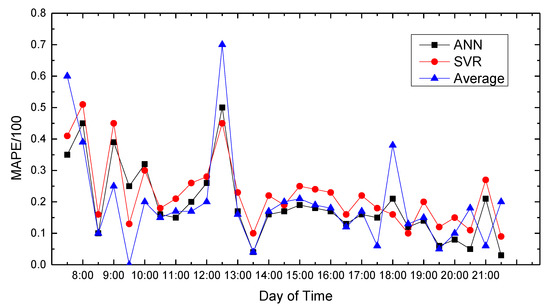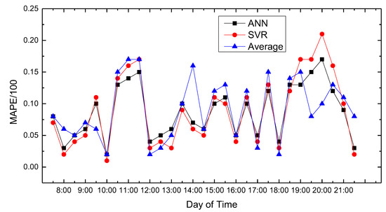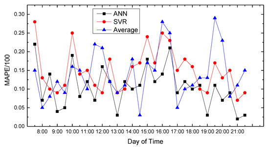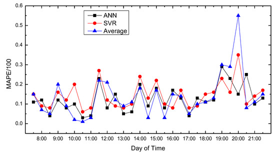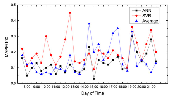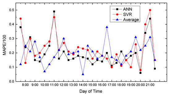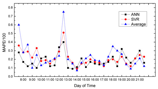 Figure 7 show the average absolute percentage error results for weekend traffic conditions that the model obtained. Analysis showed that because people’s travel time and destination are very different between weekends and weekdays, and the purposes of travel every weekend have great randomness, the predicted average absolute values change greatly, and the prediction accuracy decreases.