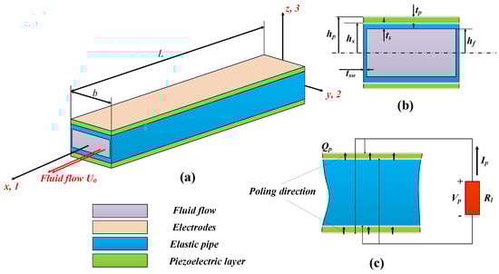 We consider here a piezoelectric composite cantilever pipe of length L and width b conveying fluid flow, as shown in Figure 1a. We set the origin of a coordinate system to be the geometric center of the cross section of the piezoelectric composite pipe at the fixed end. The piezoelectric composite pipe consists of an elastic hollow pipe with two identical piezoelectric plates of thickness attached to its upper and lower surface. In the z direction, the wall thickness of the elastic pipe is while in the y direction, its wall thickness is . Without loss of generality, we assume in the following analysis that span-wise thickness of the flexible is small compared to all other geometric dimensions of the elastic pipe and can be thought to be zero. Dimensions of the cross section of the piezoelectric composite pipe, which is symmetric with respect to the plane, is thus shown in Figure 1b. Inner height of the flexible pipe is , which is also the height of the conveyed fluid flow. As a result, we then obtain the z coordinates of the upper surface of the pipe and upper surface of the piezoelectric layer as and , respectively.