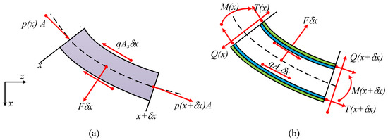 where and are the accelerations of the piezoelectric composite pipe element in the x- and z-directions, respectively, T is the longitudinal tension in the composite pipe, Q is the transverse shear force, M is the bending moment, and and are the unit length of the attached piezoelectric layers and elastic pipe, respectively.