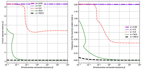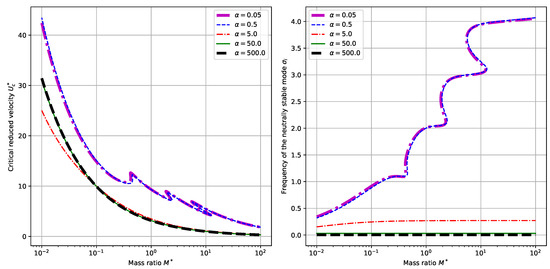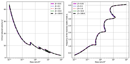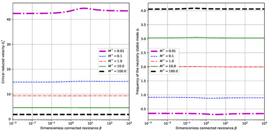 To begin with, we explore the dependence of system behaviors upon the mass ratio . By setting the dimensionless electromechanical coupling and choosing different values for the externally connected resistance , we can calculate the critical reduced velocity and the corresponding neutrally stable frequency , respectively. (Here the neutral stability means that the eigenvalue corresponding to the eigenmode has zero real part . Thus we denote the neutrally stable frequency of the mode by hereafter.) The results are plotted in Figure 3. It is shown that in the considered range of , the critical reduced velocity displays an overall trend of decreasing while the neutrally stable frequency displays an overall trend of increasing with the increasing of mass ratio . From the perspective of energy harvesting, it is desirable for the system to have a low critical reduced velocity [16]. Therefore, we tend to choose a relatively large mass ratio in the design of related energy harvesting systems. For certain values of mass ratio , there exist multiple critical velocities and corresponding neutrally stable frequencies . Besides, for this value of , no big difference is found by changing the values of from a small to a large . (Actually, in both panels of Figure 3, the differences between the curves with different values of are so small that they can hardly be discerned visually.) This can be validated by checking the Equation (17). Since the term occurs as a whole in the boundary conditions Equation (17), for a small value of , say in our case, the variance in the values of does not qualitatively and quantitatively change the boundary conditions Equation (17). As a result, the calculated curves for critical reduced velocities and neutrally stable frequencies will not be much different.