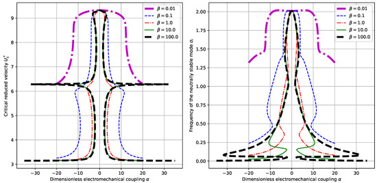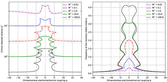 In this line of calculations, we first set a fixed value of and choose different values for . The calculated critical reduced velocities and neutrally stable frequency are shown in Figure 5. It is clearly shown that the value of has a large effect on the overall level of the critical reduced velocity . As shown in the previous subsection, the smaller the mass ratio , the larger the critical reduced velocity . Note that here the value of is allowed to be both positive and negative. This comes from the fact that in Equations (12) and (18), the term can be positive or negative for different piezoelectric materials. (Actually, for the piezoelectric material of PZT (lead zirconate titanate), is negative while for the piezoelectric material of PVDF (polyvinylidene difluoride), is positive.) Besides, from the Equation (17), we find that it is the value of that affects the boundary condition and thus the dynamical system. Hence, we are interested here in the range of in a symmetric interval. It is interesting to note that for all values of , when the absolute values of are large enough, say or in our case, the resulting values of the critical reduced velocity and the neutrally stable frequency are not much affected by the further change of . Besides, for small values of , say in our case, the influences of upon and are not obvious in the sense that the values of and do not vary too much. However, when is in the intermediate range, it will largely affect the values of and and a multiple correspondence is observed between the value of and those of and . From the point view of energy harvesting, it will be advisable to choose either small values of for higher neutrally stable frequencies or large values of for lower critical reduced velocities .