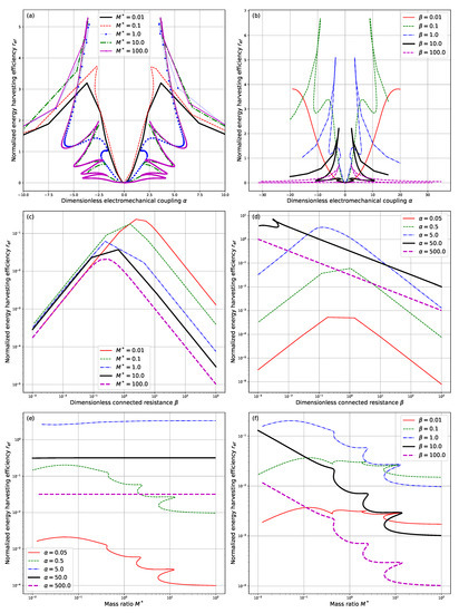 Dependence of the normalized energy harvesting efficiency upon (a) the dimensionless electromechanical coupling with and different values of ; (b) the dimensionless connected resistance with and different values of ; (c) the mass ratio with and different values of ; (d) the dimensionless electromechanical coupling with and different values of ; (e) the dimensionless connected resistance with and different values of ; and (f) the mass ratio with and different values of .