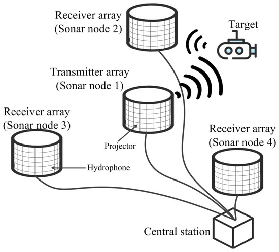 The structural demonstration of the distributed sonar system adopted in this paper is shown in Figure 1, containing one central station and several remote sensor nodes. The sensor nodes are divided into one transmitter array and several receiver arrays. All sensor nodes are connected with the central station with fibers of different length, which is also called multistatic sonar system. The transmitter array emits pulses of sounds to target, and the receiver arrays acquire the echoes from the target. Also, some pulses of sounds are directly received by receiver arrays and are referred as direct path waves. Signal processors on the receiver arrays estimate the target azimuth angle and the distance between the target and the receiver arrays, which highly rely on the high-accuracy reference clock synchronization among sensor nodes to achieve desired DOA estimation.