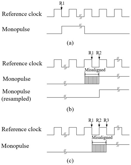Taking the i-th sensor node as an example, the working mechanism of ambiguity eliminator circuit is as follows: The pulse generator generates a monopulse at the falling edge of the reference clock. Meanwhile, the clock counter starts to record the reference clock’s cyclic number. This monopulse is converted into an optical signal and sent to the sensor node along with the reference clock. The timing of reference clock and monopulse on the central station board is shown in Figure 3a, where the monopulse is asserted at the fall edge of reference clock, . At the sonar node, due to the phase shifters on the forward lane, the reference clock is slightly misaligned with the monopulse. The misalignment range is . To eliminate this misalignment, the pulse resampling block on the sonar node is used to sample this monopulse at the rising edge of the reference clock. The resampled monopulse is then aligned to , i.e., the next rising edge of . The timing on the sonar node is shown in Figure 3b. Then, this resampled monopulse is sent back to the central station. Similarly, the monopulse is misaligned with the feedback reference clock due to the phase shifters on the feedback lane and can be recovered at , i.e., the next falling edge of . Once the clock counter block detects the rising edge of recovered monopulse, it stops counting and obtains the reference clock’s cyclic number, k.
