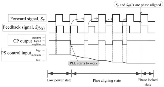 The proposed PLL in the central station is the key module for the proposed phase stabilizer. The operational states of the PLL in the central station can be categorized into three states: low power state, phase aligning state and phase locked state. In low power state, the PFD ignores all input signals and the output of CP is in high-impedance mode. Hence, the phase shifters are unmodulated and the reference signals among sonar nodes are free-running. When the controller on the central station activates the PFD into a phase aligning state, the PFD starts to capture edges of and . The CP is only active for a portion of each phase detector cycle that is proportional to the phase difference between and . The output signal of the CP serves as a current sink or source, depending on which signal is captured first. The loop filter integrates this current and results in a continuously changing control voltage applied to the phase shifters. If is captured by the PFD first, the CP outputs a sequence of positive pulses, whose duty-cycle is proportional to the phase difference, as shown in Figure 4. Otherwise, if is captured first, the CP outputs a sequence of negative pulses, whose duty-cycle is proportional to the phase difference, as shown in Figure 5. Once the phase difference between the two signals reaches zero, the system enters the phase locked state, where the PFD’s output is narrow spurs. These current spurs are due to the finite speed of the logic circuits inside the PFD and have to be filtered by the loop filter so they do not modulate the phase shifters.