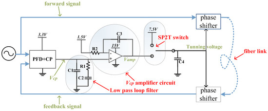 The fiber-based PLL is used to disseminate reference signals to each sensor node and measure the feedback signal’s phase constantly to compensate their mismatches due to fiber length variation. PLL is considered an effective approach to maintain signal phase, which is widely used for reference signal distribution and synchronization [28,29]. A conventional PLL comprises of a phase frequency detector (PFD) to detect the phase difference between forward signal and feedback signal, a charge pump (CP) and a low-pass loop filter (LPF) to generate output voltage proportional to the phase difference, a VCO whose instantaneous oscillation frequency is determined by control voltage [30]. We replace the VCO located at the forward lane with n cascaded phase shifters whose phase shift values are controlled by . Furthermore, we add n identical cascaded phase shifters at the feedback lane to ensure symmetry. The fiber-based PLL is illustrated as green blocks in Figure 2.