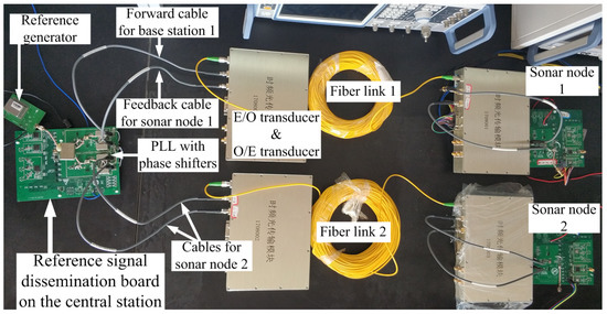 A distributed sonar system utilizes a scalable number of collaborative sensors to detect and track targets over large underwater areas, and can achieve increased coverage and reliability compared to a traditional towed sonar system. The system can also improve the spatial resolution of detection, boost the accuracy of target parameter estimation and resilience to signal fading [1]. Detailed descriptions about distributed sonar system can be found in Refs. [2,3,4] and “Distributed Agile Submarine Hunting (DASH)” program disclosed by the Defense Advanced Research Projects Agency (DARPA) [5]. To accurately measure the direction of arrival (DOA) of echoed signals, all sensor nodes share a highly stable reference signal. This reference signal is provided by the central station and disseminated to all sensor nodes through optical fibers with different lengths. This could induce misaligned reference signals at different sensor nodes. Besides, different temperature and mechanical expansions of fibers could create fiber length variations. To stabilize the reference phase of each sensor node, these issues must be resolved.