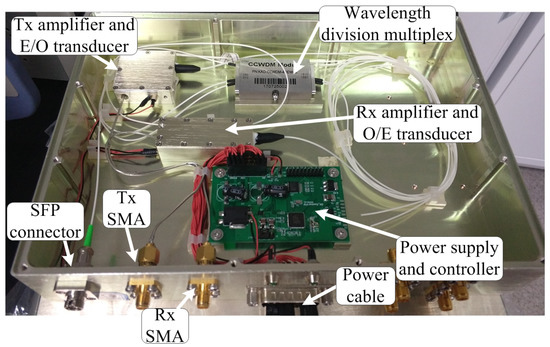 Figure 8 is an eagle view of the physical realization of the electronic-optical transducer modules. Each module contains three signal IO ports, i.e., a transmitter (Tx) SMA port, a receiver (Rx) SMA port, and an optical SFP port. The Rx port receives the electronic signal and sends it to the electronic-to-optical transducer, where this electronic signal is transformed to modulated light, and fed to the optical fiber connecting the SFP port. On the contrary, the feedback optical signal is received at the same SFP port, then transformed back to electronic signal and sent out at the Tx port.