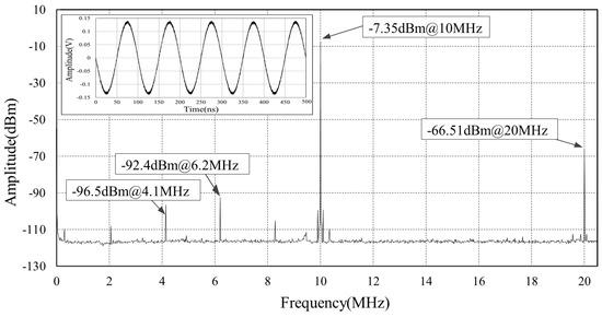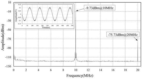 Figure 9 and Figure 10 show the effect of the E/O transducer module on the signal. We use a 10-MHz reference signal feeding to the E/O transducer module. Through a 100 m long fiber, this optical microwave is then received by another E/O module and recovered to electronic signal. Figure 9 depicts the signal before transmitting. The signal power is −9.73 dBm with −75.73 dBm second harmonic spur. Figure 10 gives the spectrum of the recovered electronic signal revealing several spurs around 2 MHz, 4 MHz, 6 MHz, which is introduced by the E/O modules. These low frequency spurs can be filtered by onboard band pass filters and hence neglected. It is worth to note that the recovered signal power at 10 MHz is 2.38 dB larger than that before transmitting, because amplifiers are adopted at both ends of the fiber to recover signals.