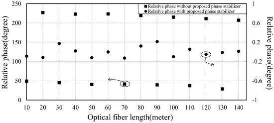 The residual phase difference before and after utilizing the proposed phase stabilizer is demonstrated in Figure 15. The wrapped phase difference between the recovered reference signal at the sensor node board and the reference signal at central station board is measured. The sensor node is connected to the central station by optic fibers of different length. The frequency of disseminated reference clock is 10 MHz. We can see that without the proposed phase stabilizer, the wrapped phase difference changes dramatically with the fiber length variation, about /m. However, by using the proposed phase stabilizer, the wrapped phase difference is reduced to less than .