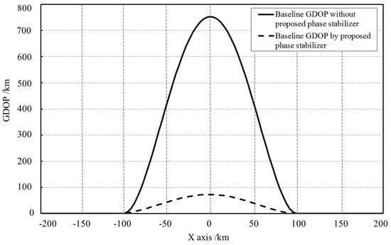 Figure 17 reveals that the GDOP is distributed symmetrically versus the x axis (baseline). The GDOP distribution can be divided into three zones: Baseline zone, where the GDOP value is pretty high. The GDOP value increases rapidly when the target approaches the baseline. The GDOP value on the baseline is too high to detect target; High accuracy zone. The GDOP value around the receiver array is very low. The GDOP decreases rapidly when the target approaches the receiver array and the system can detect objects with high accuracy. The outer zone is far away from the baseline and receiver array. In outer zone, the GDOP value is moderate and the contour lines are like circles with the center of the circles located near the receiver array. The GDOP value increases gradually as the target leaves the receiver array. Comparison between Figure 17a,b reveals that, with the proposed phase stabilizer, the baseline zone shrinks obviously and the high accuracy zone extends, meaning that the overall detecting accuracy is improved. The GDOP value along the baseline is also drawn in Figure 18. Without the proposed stabilizer, the GDOP’s peak value is 750 km. By using the phase stabilizer, the peak value is decreased to 80 km.