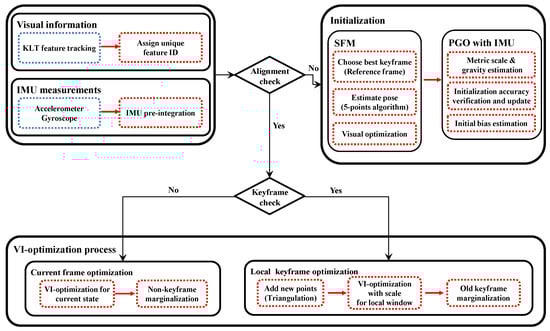 Initially, VIO was approached by loosely-coupled fusion of visual and inertial sensors [1,2]. An extended Kalman filter (EKF) [3,4] is also used, as it can update the current state (e.g., the 3D pose and covariance) by solving a linearized optimization problem for all state variables in a tightly-coupled manner [5,6,7]. The filtering-based approaches can estimate the current poses fast enough for real-time applications; however, they are less accurate than the optimization-based approach because of the approximation in the update step. Recently, optimization-based algorithms [5,6,7,8] have been developed for higher accuracy, but they require higher computational cost and suffer from divergence when the observation is poor or the initialization is not correct. Certainly, there is a trade-off between performance and speed, and it is difficult to optimize all the parameters in the initialization and update phase, especially when the information is insufficient.