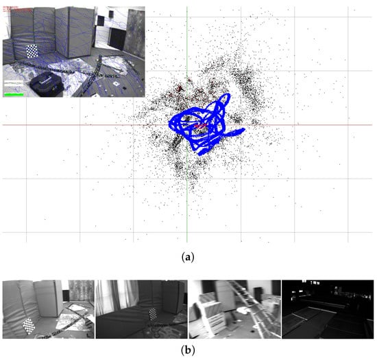(a) An example result of the proposed system for V1-02 of the EuRoCbenchmark dataset. The blue line is the estimated trajectory; the black dots are the reconstructed sparse landmarks; and the red quadrangular pyramid represents the current camera pose. (b) Captured images in EuRoC with various challenges, such as motion blur and illumination changes. Our proposed system is able to estimate reliable poses for all sequences of EuRoC datasets (Section 6).