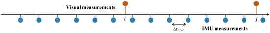 The measurement rate of the IMU is much faster than that of the camera, as illustrated in Figure 4, and it is computationally burdensome to re-integrate the values according to the changes of the state in the optimization framework. Thus, we adopt the pre-integration method, which represents IMU measurements in terms of the poses of the consecutive frames by adding IMU factors incrementally as in [7,29].
