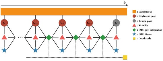 Illustration of the proposed visual inertial local bundle adjustment. All keyframe poses contain the visual terms with landmarks and the IMU pre-integration factors with a common local scale parameter. The current frame n (which may not be a keyframe) is included in the local window with the accumulated IMU pre-integration.