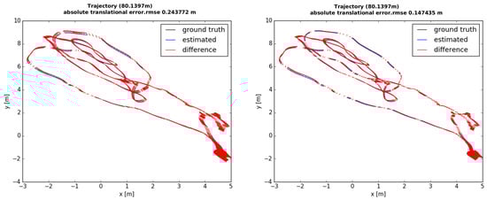 The difference in the trajectories from the ground-truth to the optimization without the scale (left) and the proposed optimization with the scale parameter (right). The estimated trajectories are aligned to the ground-truth via a rigid transform (special Euclidean group ) using the Technical University of Munich (TUM) RGB-D benchmark tool [31]. The proposed method is able to accurately estimate the poses by updating the scale incrementally.