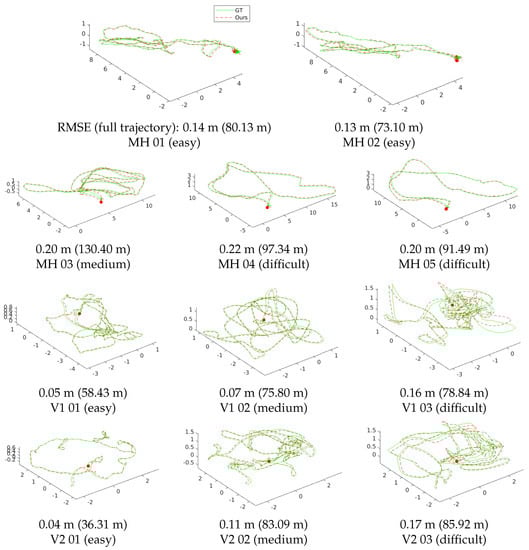 We compare the proposed algorithm with the recent state-of-the-art approaches using the same evaluation method by Delmerico and Scaramuzza [33], where the evaluation results of the VIO systems were presented. All parameter settings are kept unchanged in all tests, and the metric is the RMSE position error over the alignment trajectory to the ground-truth pose via [44]. Note that, because our proposed method is not a SLAM system, we only compare ours with the systems that do not have loop closing. We directly compare the RMSE results with those of Open Keyframe-based Visual-Inertial SLAM (OKVIS) [5], Robust Visual Inertial Odometry (ROVIO) [45], Monocular Visual-Inertial Systems (VINS-Mono) [17], Semi-direct Visual Odometry (SVO) + Multi Sensor Fusion (MSF) [46,47], and SVO + Georgia Tech Smoothing and Mapping (GTSAM) [29] presented in [33].