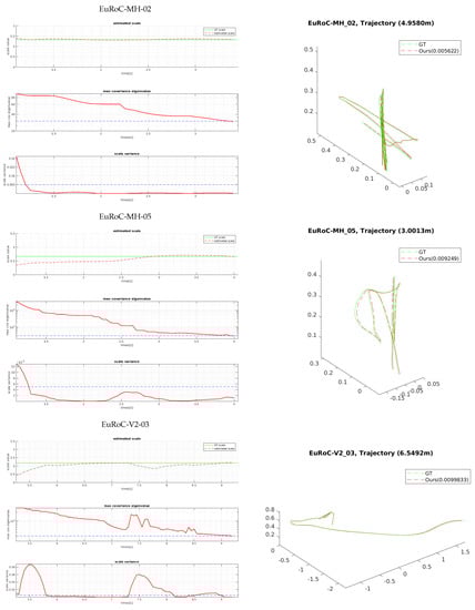 The estimated scale graphs of Figure 11 show that our estimated scale variable converged to the optimal scale in bootstrapping. The true scale value is computed by aligning the estimated visual trajectory with the ground-truth poses via similarity transformation [42]. The two graphs below them show the convergence-check parameters in bootstrapping, which are described in Section 5.3. Experimentally, we set the maximum eigenvalue of the covariance to 30 and the scale variance to 0.005. Note that the variances can be estimated when there exists meaningful motion. For example, in Figure 11, the first 0.6 (MH 02)∼5.1 (V2 03) seconds are not used. When both metrics drop below the thresholds, bootstrapping is finished, and the estimated scale is applied to the entire trajectory. In contrast, ref. [6] is designed to wait for 15 s to find the initial variables (scale, gravity, and biases) by the closed-form solution. Once the parameters are found at the beginning, they are not updated afterwards; thus, if the calculated scale variable is not accurate, the following pose estimation can fail completely. Compared to [6], our method provides an adaptive and reliable bootstrapping.