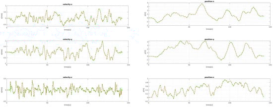 The comparison of the ground-truth velocities and positions with ours for V1 01. The ground-truth values are plotted in green lines, and the estimated values are the red dashed lines. The positions and velocities computed by the estimated scale from the bootstrapping and updated by the local scale parameter align well with the ground-truth.