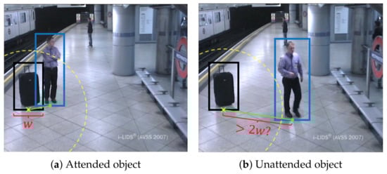 The second strategy does differentiate between attended and unattended objects, and only unattended objects will be considered as abandoned. They do not contemplate owner identity identification, but they establish a proximity rule [,]. The closest person within a radius centered in the abandoned object will be considered as the owner attending the object; this way, the system will not identify it as abandoned. The main advantage of this strategy is the considerable reduction of false detections; however, failures at the people detector can lead to a missed detection.