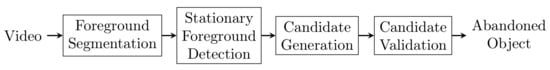 The frameworks of AOD systems proposed in the literature can be unified using the diagram of Figure 2. This diagram consists of several stages for foreground segmentation (i.e., detect the regions of interest or blobs), stationary foreground detection (i.e., determine which ones do not move for a certain period), candidate generation (i.e., identifying the objects potentially being abandoned), and candidate validation (i.e., deciding whether the objects are abandoned or not). Existing proposals for abandoned object detection may partially implement the above-mentioned definition of abandoned objects by using only the first and second stages for the temporal rule; and the third and fourth stages for the spatial rule. As the performance of each stage relies on the previous one, AOD research is often directed towards the first and second stages.