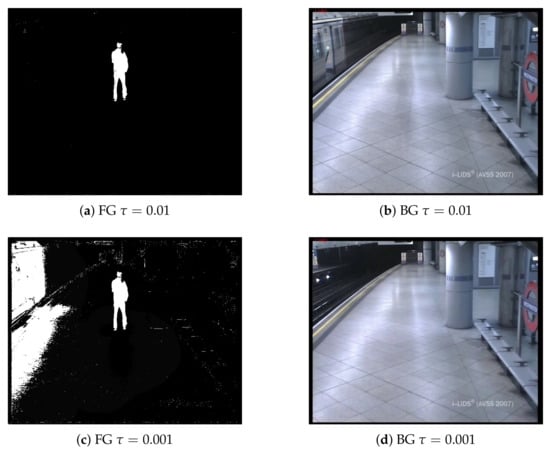 Examples of different adaptation rates for background subtraction based on the Mixture of Gaussians approach [] for Frame 1180 of the sequence AVSS_AB_2007 (http://www.eecs.qmul.ac.uk/~andrea/avss2007_d.html). Subfigures (a,c) show Foreground (FG) masks with different parameter , which controls the update rate of the Background (BG) models, that are depicted in subfigures (b,d).