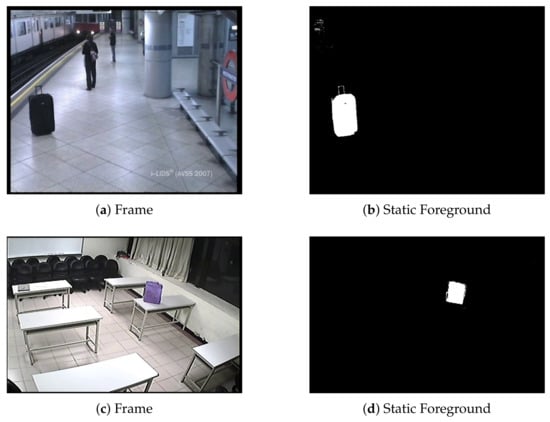 where each pixel  in  is increased (decreased) by  () when foreground (background) is detected in the foreground segmentation mask ,  is adjusted to reach one when the user-defined alarm time T is completed, and  should be high to allow fast decreases of  values when the background is detected (though in practice, a high value may lead to false negatives due to the camouflage of occluding objects). Therefore, when the foreground is detected, the staticness increases with time. Then,  is a spatio-temporal modeling of the persistence; thus, thresholding this map leads to a stationary foreground mask (usually, the threshold is close to one). Figure 4 depicts examples of stationary foreground masks obtained with a persistence approach.